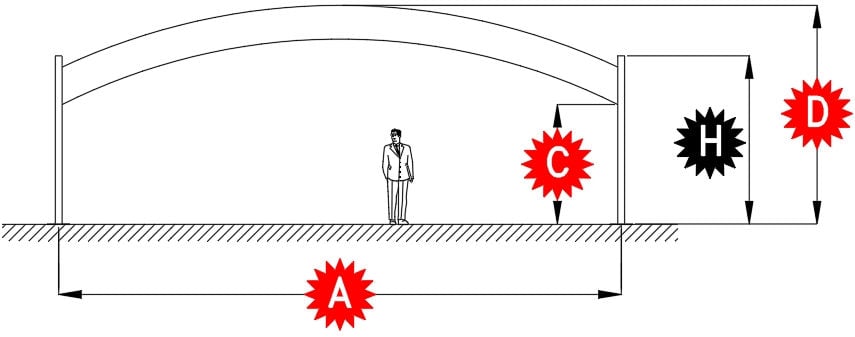 La Tendostruttura LUNA è disponibile nella larghezza (A) da 6-8-10-12 e 14 m mentre la profondità è modulare di 6 m. L'altezza utile (C) può essere 2,26 m o 2,70 m a seconda dei modelli.